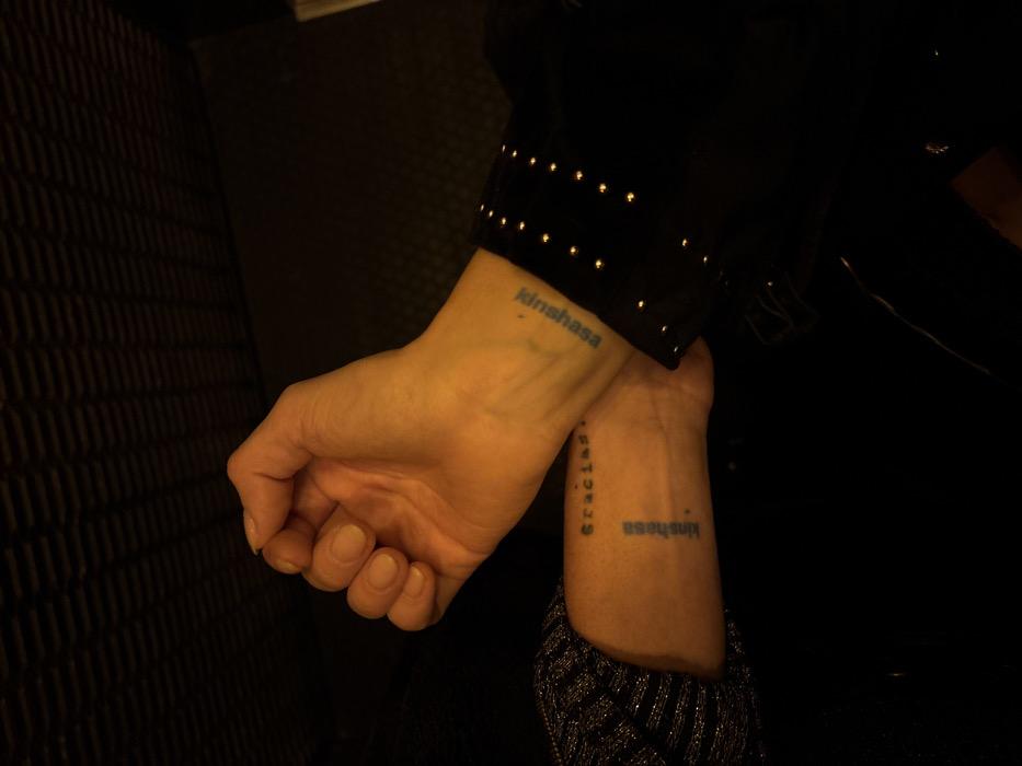 Two wrists display tattoos. The left wrist shows the word "Kinshasa" in blue ink. The right wrist also bears "Kinshasa," alongside "gracias" written vertically above it in a similar blue hue. The left arm is exposed, revealing fair skin and short fingernails. The right arm is partially covered by a dark fabric with a shimmering texture. The left wrist is close to a black jacket with gold studs, and the background consists of a dark, indistinct texture.