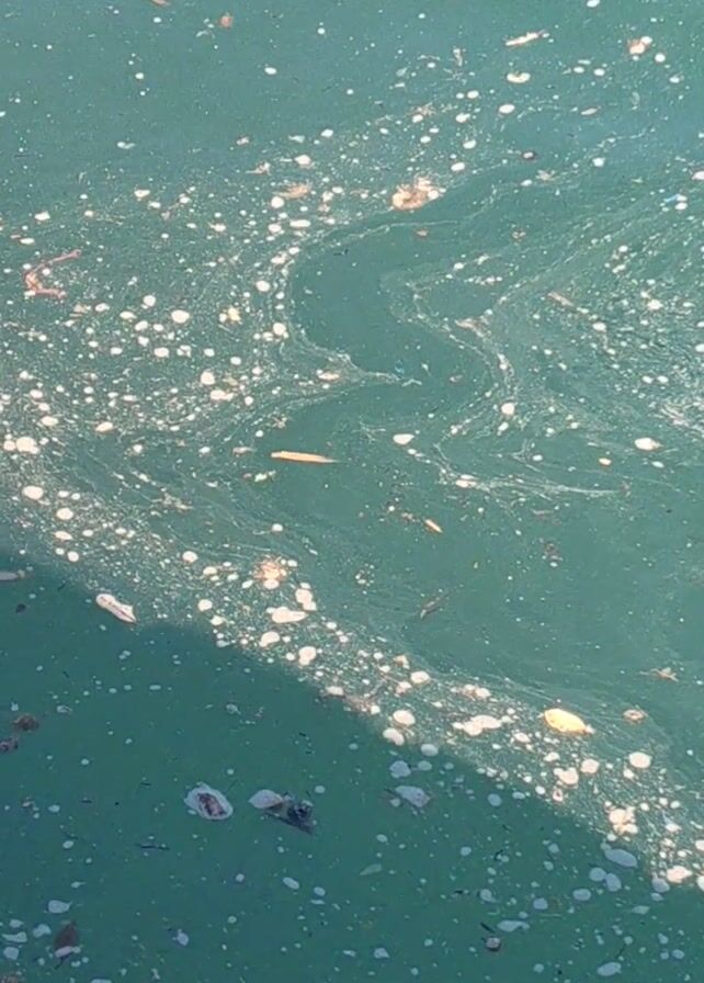 close-up, overhead shot of murky green water. The water's surface is covered with small white spots, streaks of white foam, and scattered bits of debris, including what appear to be small pieces of organic material like leaves or twigs. A diagonal area of brighter, more concentrated white spots suggests the reflection of light on the water. The overall impression is one of polluted or stagnant water.