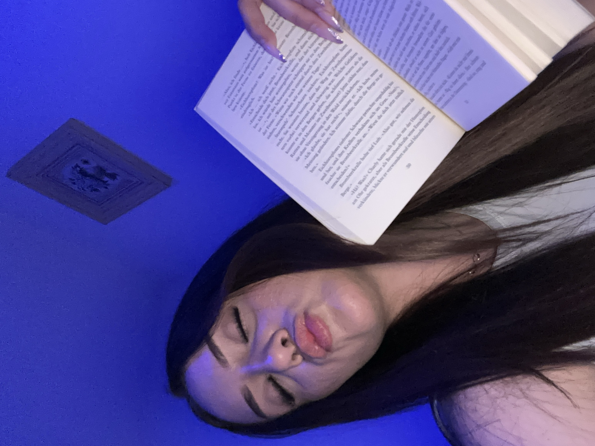 A close-up, low-angle photograph taken indoors features a female subject under blue ambient lighting. The subject, positioned in the lower-left quadrant, has long, dark brown hair, closed eyes, and pursed lips. She wears a light-colored top and a delicate necklace. Her right hand, adorned with long, almond-shaped fingernails painted with glittery silver polish, holds an open book with white pages containing German text; the number "50" is visible at the bottom of the right page. In the upper right quadrant, a diagonally mounted, framed decorative item with an ornate border and dark central design is visible against a uniformly blue background, likely a wall or ceiling. The specific location within Melle, Germany, cannot be determined from the visual evidence presented.