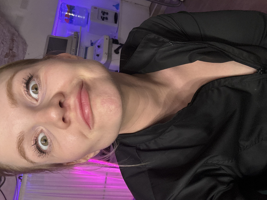A close-up image taken in a room in Saint Petersburg, Russia, features a light-skinned female subject with light hair pulled back, wearing a black zippered jacket that is partially unzipped
