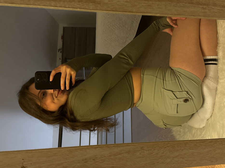 The image displays a young adult female capturing a mirror selfie indoors. The subject is reflected in a full-length mirror with a light wooden frame, positioned kneeling or crouching on a white, fluffy rug or cushion. She is angled with her body partially turned to her left, holding a dark-colored smartphone in her right hand to take the photograph. A faint smile is visible on her face, which is partially obscured by the phone. She is wearing an olive-green, long-sleeved crop top with textured detailing, light green cargo-style shorts featuring flap pockets with buttons on the rear, and white mid-calf socks with black stripes. The background, visible through the mirror, reveals an indoor environment containing a dark wooden dresser with multiple drawers, a section of a bed with white bedding, and a structure of horizontal wooden slats, possibly a railing or partition. The flooring visible is light-colored. The specific location in the city of Cava de' Tirreni, Italy, cannot be determined from the visual evidence within the image.