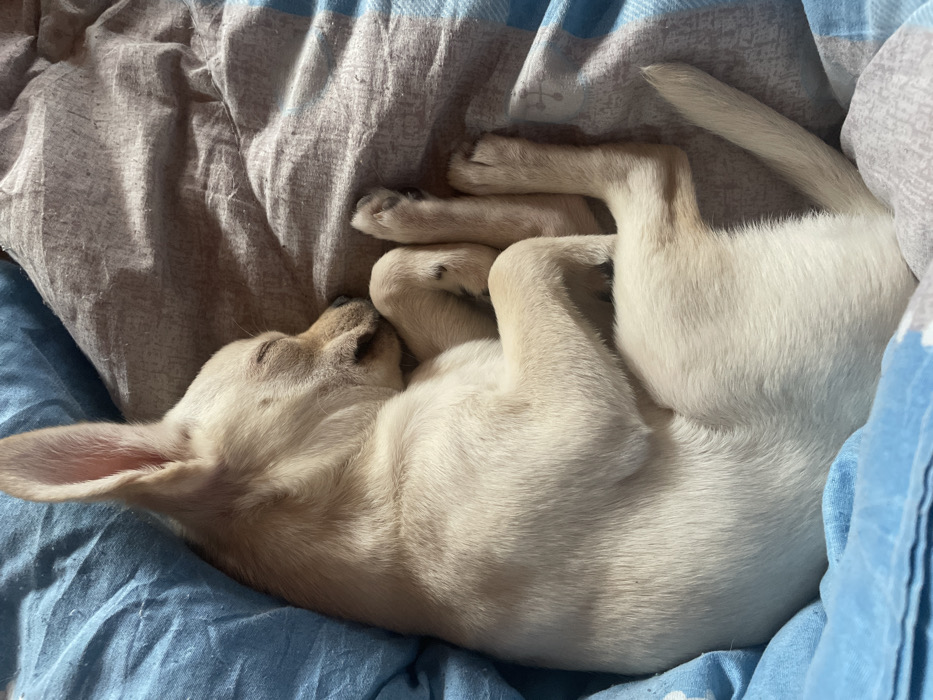 - "A light tan-colored small dog, possibly a Chihuahua or mixed breed, is depicted sleeping, curled into a compact position" by FM-5ViOy2, licensed under CC BY 4.0