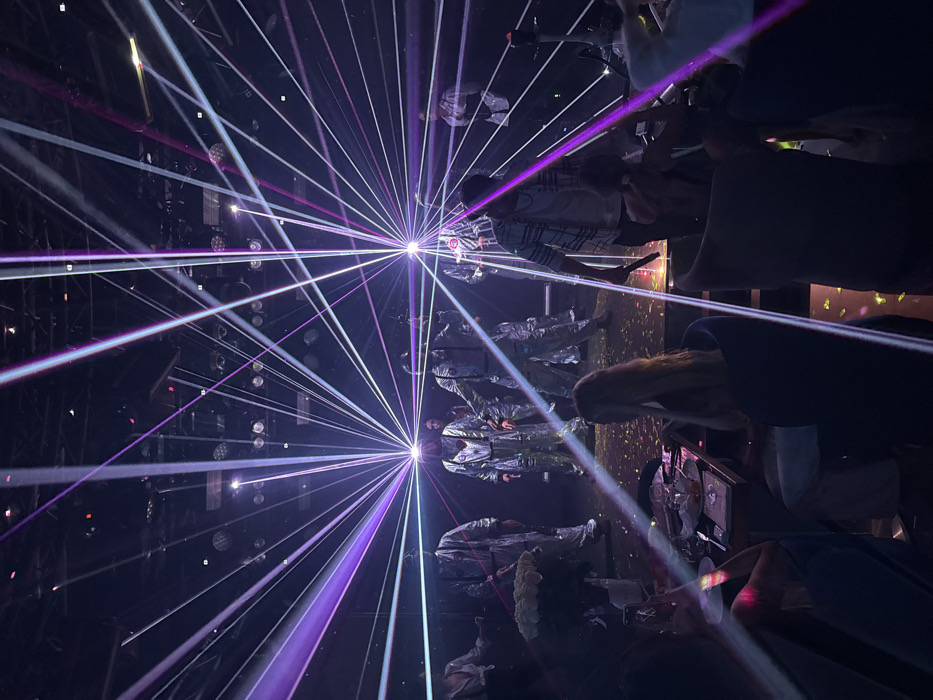 A crowded, dimly lit venue explodes with purple and white laser beams. Four performers in shimmering silver suits stand center stage. Audience members are visible in the foreground and background, some holding drinks. Spotlights shine down on the performers, creating a dynamic and electrifying atmosphere. Reflections enhance the visual spectacle, contributing to the vibrant energy of the event.