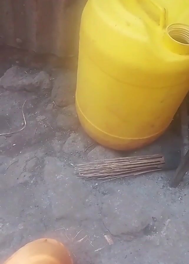 yellow plastic jug standing on a concrete floor next to a bundle of sticks
