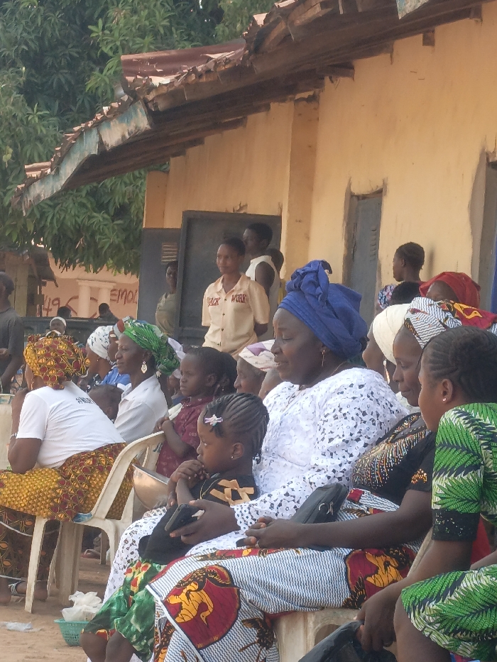 The image depicts a gathering of individuals, predominantly women and children, in an outdoor setting in the city of Akwanga, Nigeria