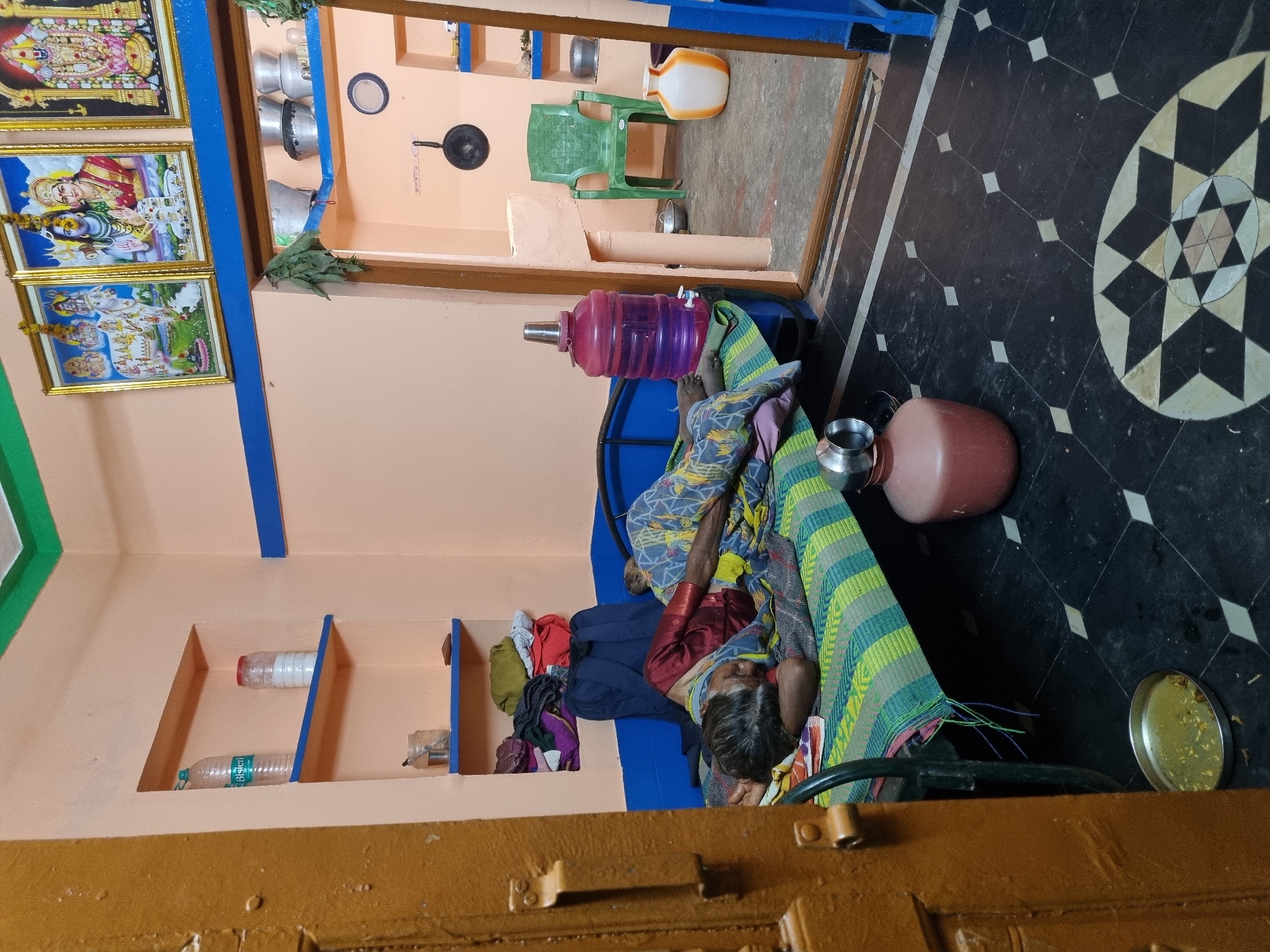 In a room in Pedda Kammavaripalli, India, an elderly woman is lying on a blue-framed bed covered with a green and blue striped mat and patterned blankets. Her head rests on her hand. Next to the bed on the patterned black and white floor is a clay pot and a metal container. A metal plate with food is on the floor closer to the viewer. A large purple water bottle is near the head of the bed. The walls are light orange with blue trim. On one wall are framed religious pictures. On another wall are small recessed shelves with bottles. A doorway reveals an adjacent room with various household items, including a green plastic chair and metal cookware.