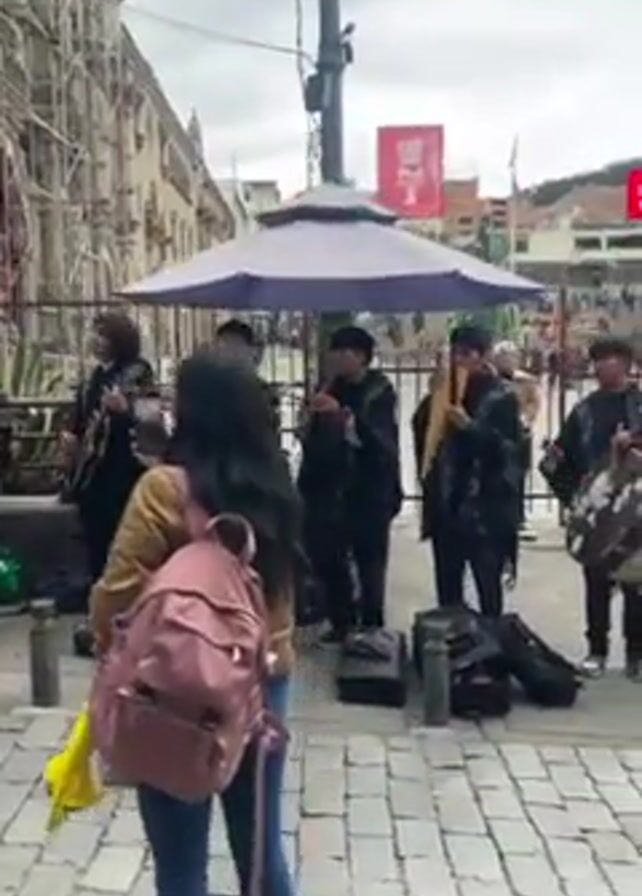 A group of musicians, dressed in dark clothing, are playing various instruments including guitars and panpipes on a cobblestone street. A woman with a pink backpack is standing in front of them, facing the band. An umbrella provides shade for the musicians. A large building with scaffolding is behind the band, and the scene is bustling with people.