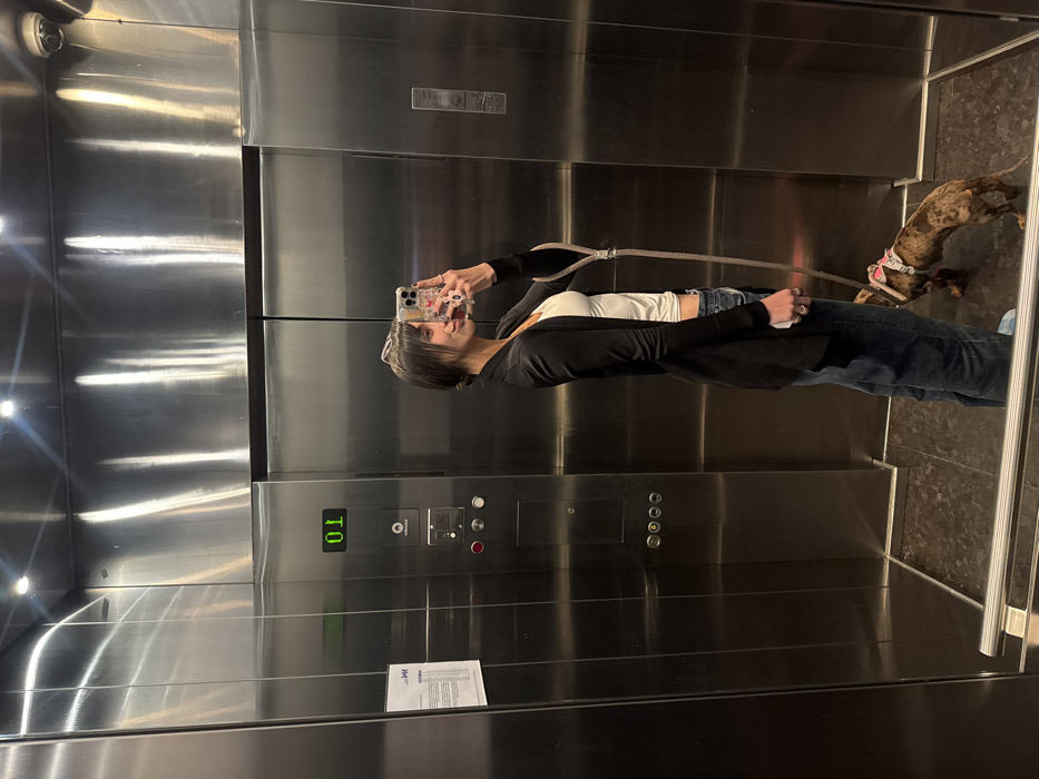 In a mirrored elevator, a woman stands, holding a phone to take a selfie. She is wearing a white top, blue jeans, and a black cardigan. Beside her, a mottled brown and tan dog stands on a leash. The elevator panel shows the floor as '10'. The elevator's interior is primarily stainless steel, reflecting the lights and the figures within. A small notice is affixed to the elevator wall.