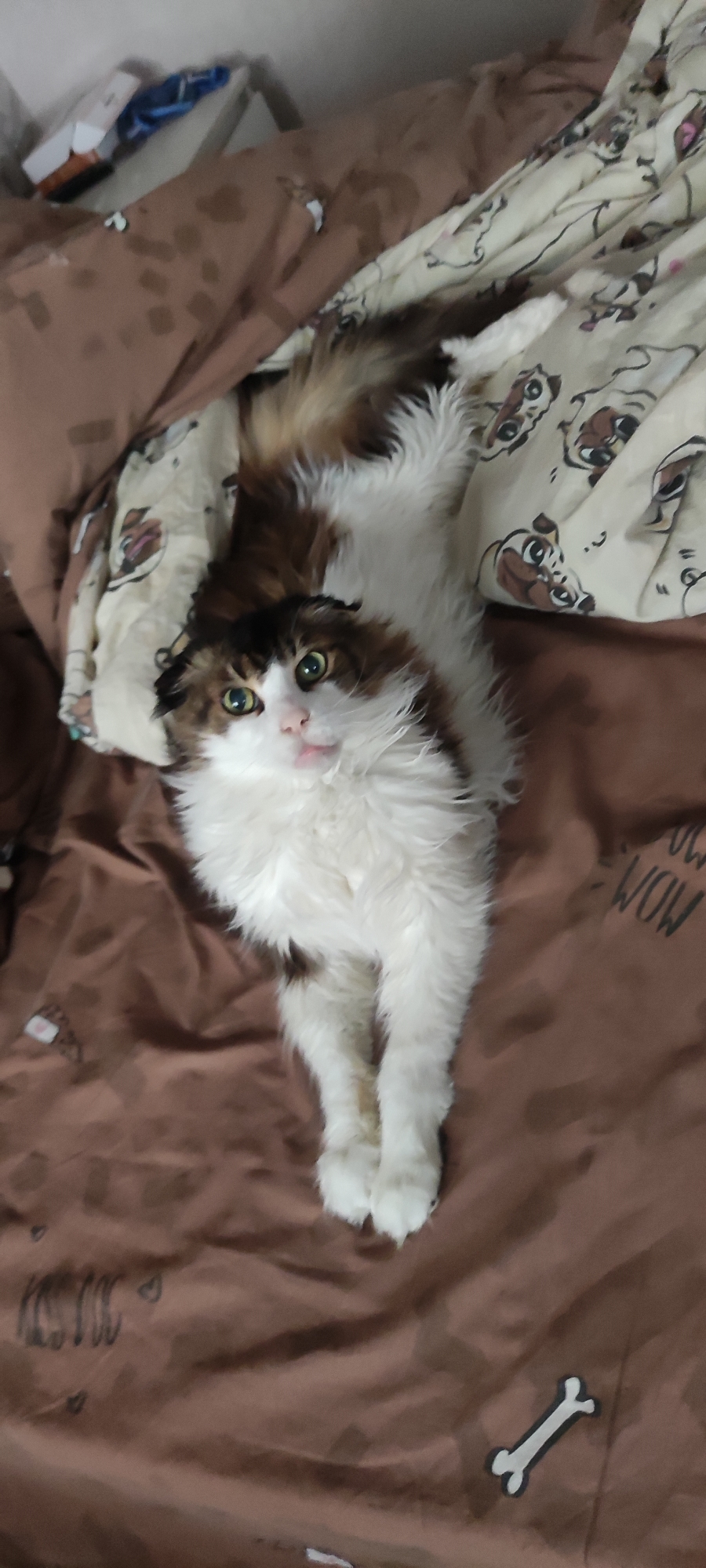A medium-shot shows a fluffy white and brown cat on a bed in a domestic setting. The cat has green eyes and appears to be looking directly at the camera. The bedsheets are a mix of brown and beige with cartoon dog patterns. A bone design is printed on the brown sheet. The location is inferred to be Chaikovsky, Russia.