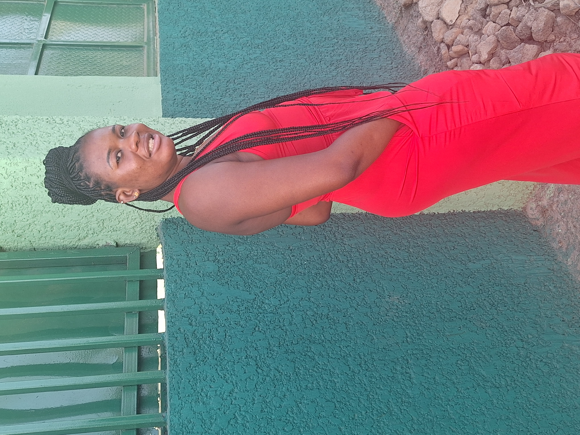 A woman stands near a building in Sabon Tasha, Nigeria. She is wearing a red dress. The building has green window bars and a textured green wall. There are rocks to the side.