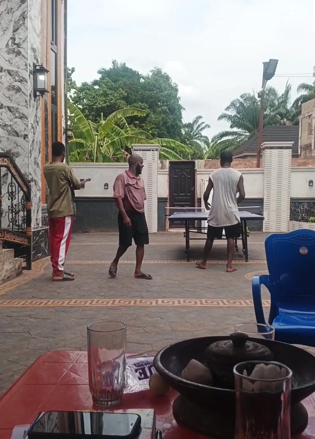four people on a paved patio playing table tennis. The camera is positioned under the overhang of a building, looking out toward the yard. On a red plastic table in the foreground, there's a smartphone, a notebook, glasses, and a bowl containing objects resembling stones or herbs. The yard is enclosed by a white fence, and lush greenery, including banana trees and palm trees, can be seen beyond the fence. The patio's pavement is patterned with a geometric design. One man stands near the camera wearing a green shirt and striped pants. Another man in a maroon shirt and black shorts walks towards the table tennis players. Two men are actively engaged in playing table tennis on a dark-colored table in the center of the yard. The sky appears overcast.