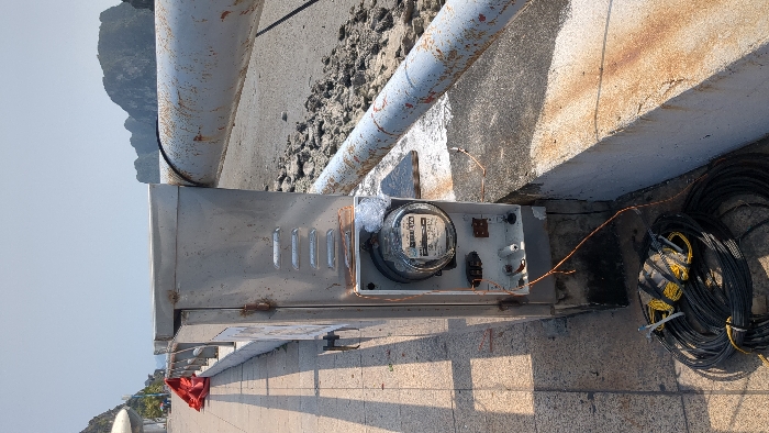 The image captures an outdoor scene in Hong Gai Ward, Ha Long City, Vietnam, along a waterfront promenade overlooking Ha Long Bay. In the foreground, a weathered, light gray metallic utility box, exhibiting rust spots and featuring multiple horizontal vents, is mounted on a concrete barrier. A circular, glass-fronted electricity meter, with a white face and dark markings, is recessed into the lower section of the utility box, its protective cover appearing damaged or absent. Below the meter, exposed electrical components, including two white cylindrical connectors and wiring, are visible. A thin, orange-brown insulated wire extends from this assembly downwards. On the paved ground directly below the utility box, a large coil of black electrical cable is present. Resting on or near this coil are a smaller coil of yellow cable and a silver-headed tool, resembling pliers or a wrench, with a black handle. To the right, a long, rusted, light gray metal pipe extends horizontally, functioning as a barrier. This pipe is positioned above an unpaved area of dirt and small rocks. To the left, a tiled pedestrian walkway is visible, leading towards a crumpled red tarp or fabric situated near a curved white architectural structure. The background features calm water and numerous distinctive limestone karstic islands or mountains under a hazy, light blue sky. No individuals are depicted.