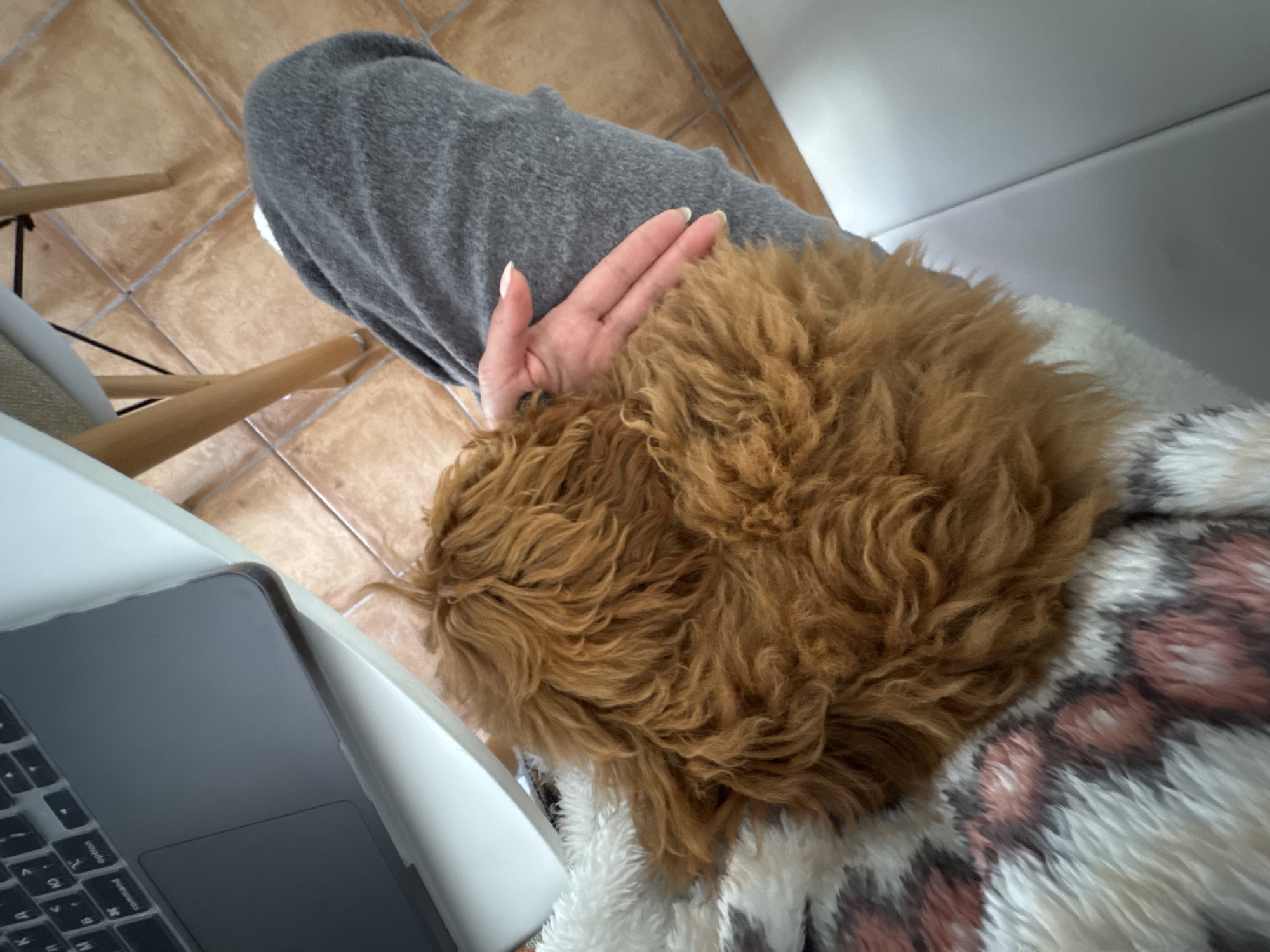 A high-angle shot shows a person sitting with a brown, fluffy dog resting on their lap