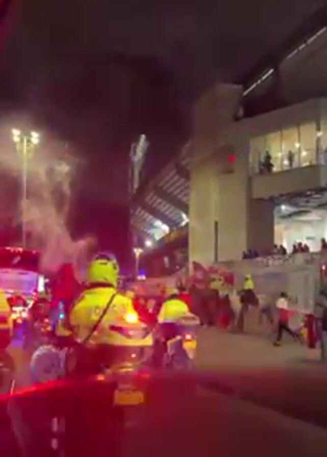 At night, a video shot from inside a vehicle depicts the scene outside a large building, likely a stadium, where a crowd is gathered. Police motorcycles with flashing lights are lined up in front of the vehicle, and a bus is also visible. Smoke hangs in the air, adding to the atmosphere of activity and potential excitement. The building's architecture is modern, with exposed steel structures and illuminated windows revealing people inside. The police presence suggests a planned event or potential crowd control measures.