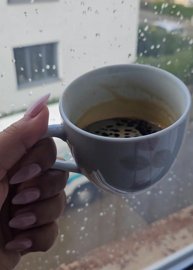 A close-up shot shows a person holding a white coffee cup with a gray floral design. The cup contains black coffee with a visible surface pattern. The person's hand has long, pink-toned artificial nails. The background is blurred due to the focus on the cup, but it's apparent that the scene is indoors with a window covered in raindrops. Outside the window, a blurry view of a white building, greenery, and a white van with a blue stripe is visible. It is raining outside. The camera slowly zooms into the window with raindrops.