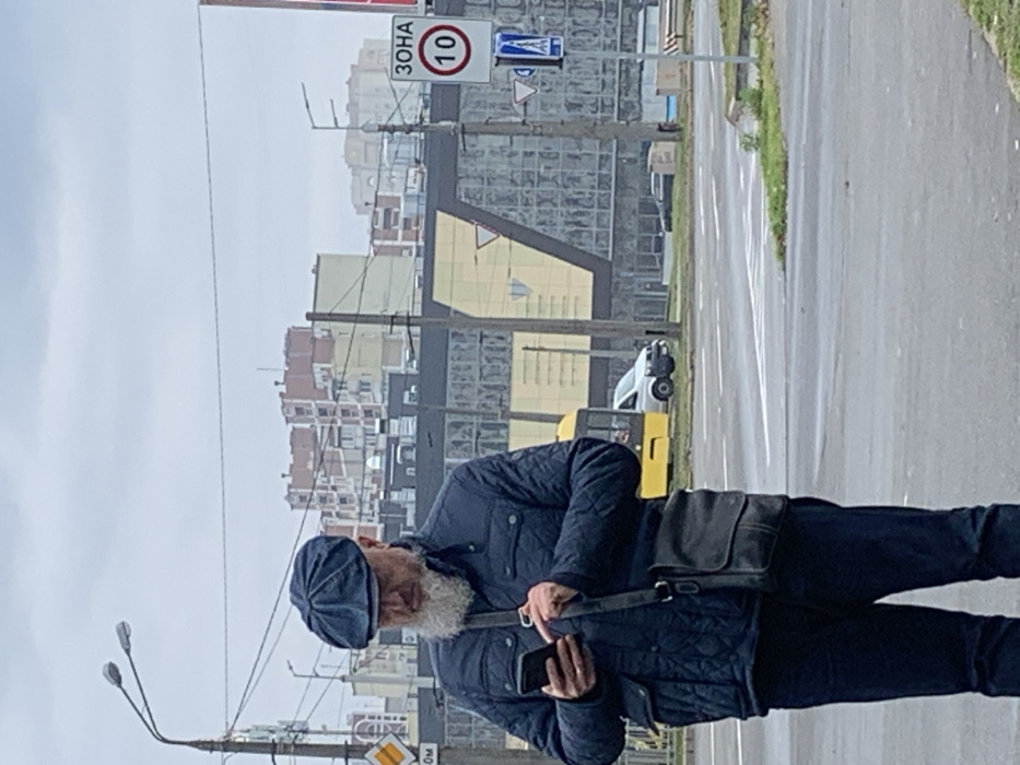 A man with a white beard and a blue cap stands on the edge of a road. He wears a navy blue quilted jacket, dark pants, and a black shoulder bag. He holds a phone in his hand. Behind him is a street with buildings and traffic signs. The sky is overcast, and the buildings include modern apartments and a commercial structure with a prominent gold-colored section.