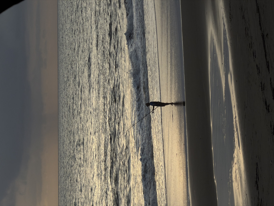 The image displays a coastal scene on a dark sand beach in Belalang, Indonesia, captured under overcast, low-light conditions. The upper sky is dominated by heavy, dark grey clouds, with a discernible vertical streak indicating rainfall in the distant horizon. Below the clouds, the ocean extends, featuring moderate waves that break into white foam and spray along the shoreline. The water's surface reflects a faint, warm, yellowish-orange light, suggesting a low sun near the horizon. A single human figure stands silhouetted in the shallow water at the edge of the breaking waves, facing the open sea. The individual, wearing a hooded garment and shorts, is barefoot. They are holding a long fishing rod, extended horizontally over the water, indicating active surf fishing. The foreground and mid-ground consist of dark, wet sand, displaying patterns from receding waves and containing several shallow, reflective pools of water.