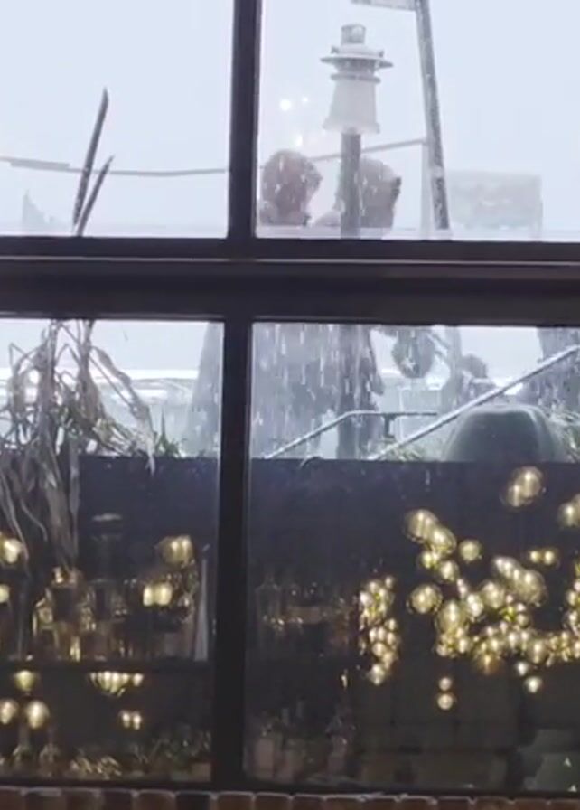 Through a large window with multiple panes, a winter scene is visible. It is snowing heavily, and the rooftops and structures outside are covered in snow. There are string lights visible on a rooftop terrace. Inside, the window is framed by a brick wall on the right side. Sounds of indistinct conversations can be heard.