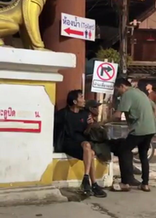 scene on a street at night. Two men are sitting on a concrete ledge built around the base of a large, elaborately decorated post featuring a golden lion statue. To the right, a third man stands and gestures as he speaks to the seated men. One of the seated men is holding a cigarette, while the other looks on. A sign on the post indicates the direction to a toilet and another sign restricts right turns. In the background, other people pass by, and there are buildings, lanterns, and a bicycle visible. The lighting is dim, but streetlights and building lights illuminate the scene.