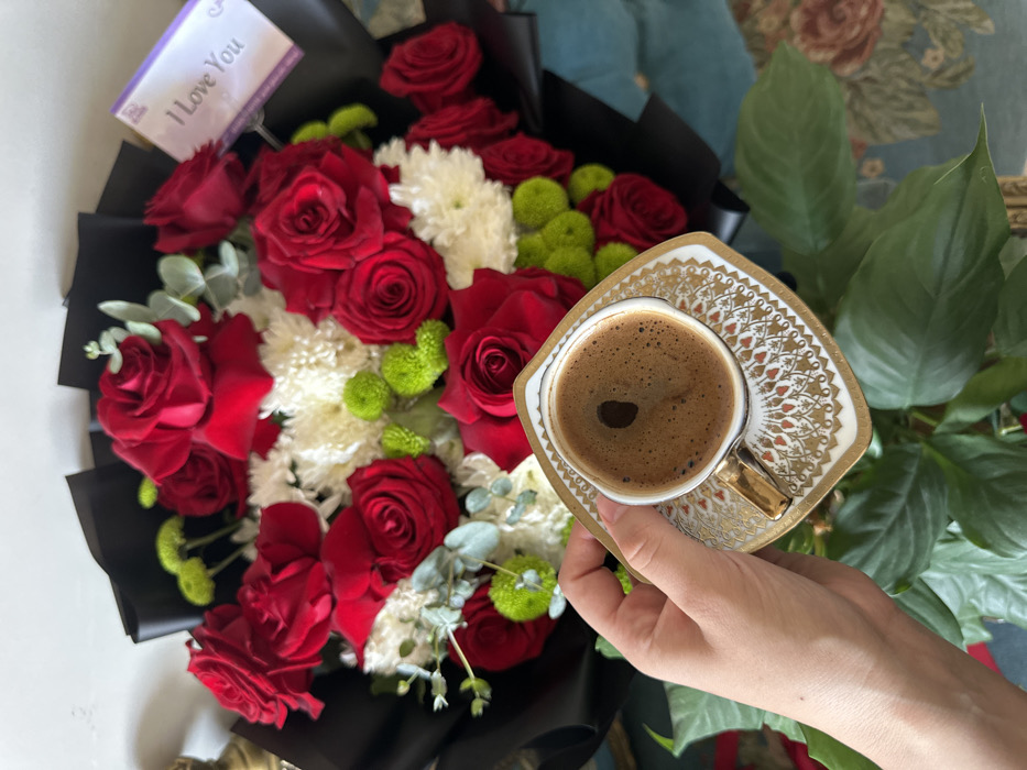 An indoor scene is depicted from an overhead perspective, featuring a light-skinned hand holding a small white demitasse cup filled with dark brown coffee, complete with a foam ring, centered on a matching square-shaped saucer adorned with gold and red/brown intricate patterns. The hand and cup are positioned above the vibrant green leaves of an unidentified houseplant. Dominating the background is a large bouquet of fresh flowers, wrapped in black paper. The bouquet is composed of numerous red roses, clusters of white chrysanthemums, and bright green button poms, accented with light green eucalyptus foliage. A small white card, displaying "I Love You" in purple text, is tucked into the upper right side of the bouquet. The precise location within Al-Muhajerin Municipality, Syria, cannot be determined from the visual evidence provided in the image. The immediate background behind the flowers is softly blurred, showing hints of a light wall and a textured, possibly patterned, surface.