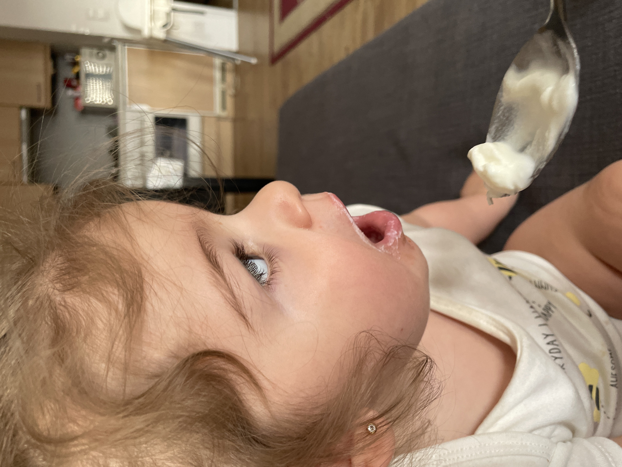 The image depicts a close-up, slightly elevated perspective of a young child being fed in what appears to be a residential kitchen or dining area in the city of Senden, Germany. The child, with light brown, curly hair and blue eyes, is positioned facing right, exhibiting an open mouth with the lower lip and chin area smeared with white, semi-solid food residue. A small, golden, stud earring is visible in the child's left earlobe. The child wears a white, short-sleeved top with faint yellow print. In the lower right foreground, a silver-colored spoon containing a dollop of white, semi-solid food is held by an unseen individual, positioned in front of the child's open mouth. The child is seated on a dark gray upholstered surface. The background, out of focus, reveals a kitchen environment with light brown wooden cabinetry, a white appliance (possibly a microwave or oven), and a partial view of wooden flooring with a section of a red and beige patterned rug.