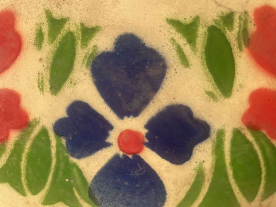 This image presents a close-up, top-down view of a decorative surface located in Awgbu, Nigeria. The surface, appearing light off-white or cream-colored, is adorned with a floral-themed pattern executed in dark blue, red, and green paint or enamel. The central element is a four-petal flower design, featuring a small, circular red center from which four dark blue, rounded, petal-like shapes extend radially. Surrounding this central motif are numerous green, elongated, leaf-like forms, often arranged in pairs or clusters. Additionally, several rounded red shapes are visible at the edges of the frame, suggesting parts of other floral elements or a continuous pattern extending beyond the captured area. The painted application exhibits a textured appearance, with visible slight wear, minor abrasions, and scattered dark specks across the surface, particularly within the blue and green areas, indicating age or exposure. No individuals, specific objects beyond the painted surface, actions, or interactions are present or discernible within the frame. The environment is limited to the close-up of this patterned surface.