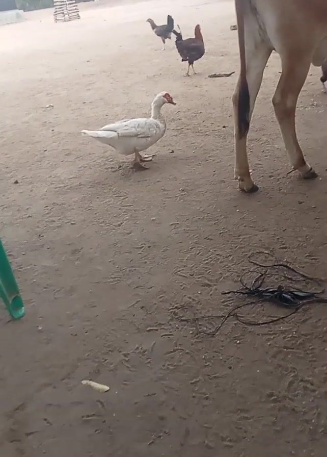 ground-level view of a rural area. The ground is dirt. The video features two cows lying on the ground. There are two chickens and one duck walking around the cows. There is also a metal bucket and some rope on the ground. The camera is in a static position.