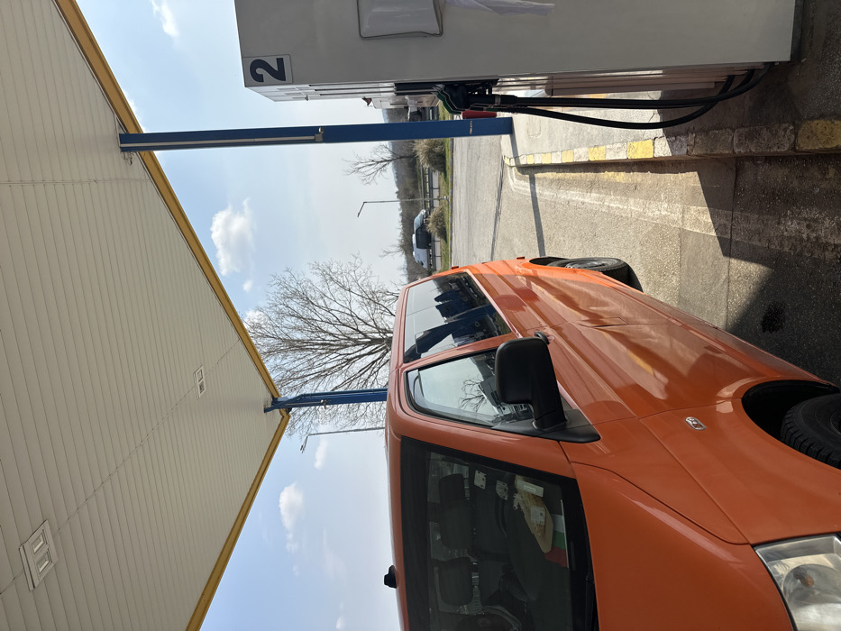 The image depicts a fueling station in Tserovo, Bulgaria, under a bright, clear sky with scattered white clouds. An orange Volkswagen T5 or T6 van is positioned at a pump, occupying the left side of the frame. The van's front left quarter and driver's side are visible, with internal items, including papers and a red and green flag-like object, discernible on the dashboard through the windshield. To the right of the van is a white and gray fuel pump, prominently marked with the number "2" on its upper section. Green and black fuel nozzles are visible hanging from the pump. A white cloth or paper towel is affixed to the side of the pump. The fueling area is covered by a white canopy with yellow trim, supported by blue pillars, under which recessed rectangular light fixtures are mounted. Beyond the immediate gas station infrastructure, an asphalt road surface leads to a wider multi-lane thoroughfare in the middle ground, where a white van and another dark vehicle are present. The background features bare deciduous trees and streetlights, indicating a rural or semi-urban setting adjacent to a main road. No individuals are visible in the scene.