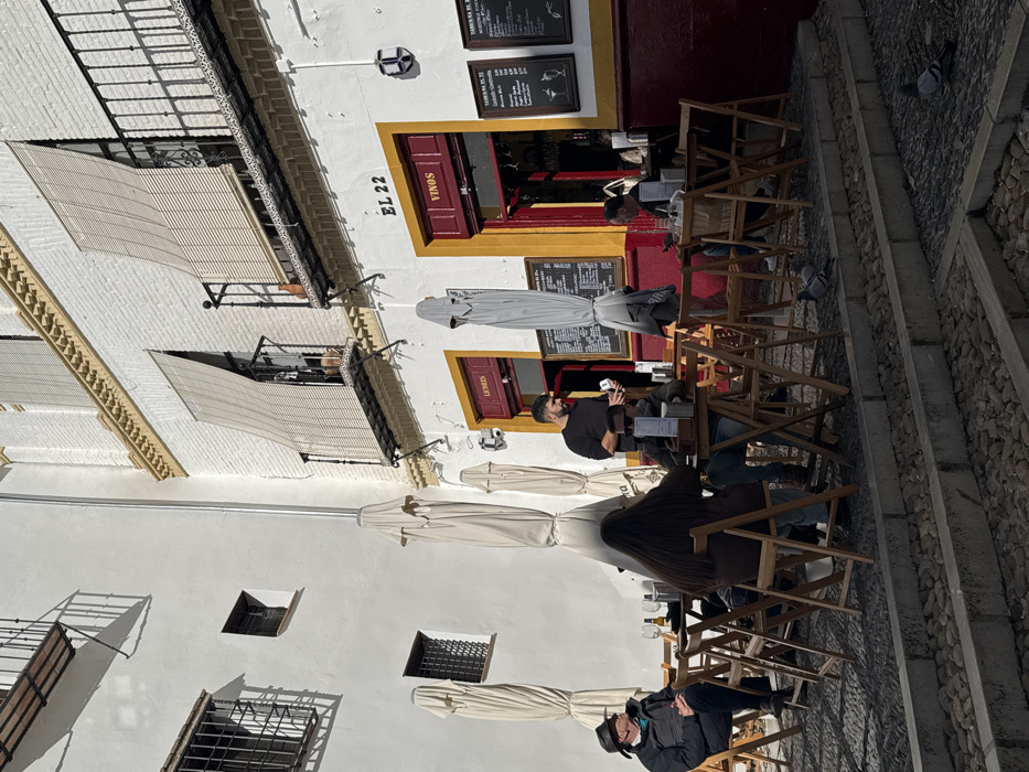 The image depicts an outdoor seating area of "EL 22," a bar/restaurant located at Carrera del Darro, 22, in the historic Albaicín neighborhood of Granada, Spain. The scene is set on a cobblestone-paved area with concrete steps in the foreground, illuminated by strong sunlight casting distinct shadows. The main building on the right features a white, brick-patterned facade with a yellow trim outlining the upper floor and around the ground-level windows and doors. The lower portion of the wall is painted a deep red. Two prominent dark red doorways, with yellow frames, are visible; the left one is labeled "LICOLES" and the right one "VINOS," with "EL 22" displayed above. Balconies with black wrought-iron railings and beige slatted blinds partially cover the windows on the upper floor. Several folded beige parasols are deployed across the outdoor dining area. On the left, a simpler white building with barred windows and a single unbarred window on an upper floor casts a shadow across the scene. Seven individuals are present. On the far left, an older man in a dark hat and jacket is seated at a wooden folding table, looking upwards and to the right. Towards the center, a man in a dark long-sleeved shirt stands near the "LICOLES" doorway, appearing to interact with a device in his hands. In the mid-ground, a person with long dark hair, seen from behind, is seated at a table, facing the bar. Opposite them, a man wearing sunglasses is also seated, holding a smartphone. To the right, two men are seated at another table; one, with dark hair, is looking at his phone, while the other is partially obscured. Various objects are visible on the wooden tables, including glasses, bottles, menu holders, and brown paper bags. Two pigeons are on the cobblestone ground in front of the tables. The lighting suggests a clear, sunny day, likely mid-morning or early afternoon, given the angle of the shadows.