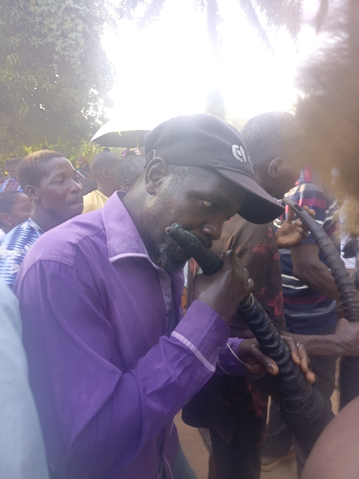 The image depicts an outdoor gathering in Akwanga, Nigeria, under bright, natural light, with prominent foliage in the background. In the foreground, an adult male with a dark complexion and a beard wears a purple long-sleeved shirt with white collar and cuff lining, and a black baseball cap featuring a white logo. He is holding a dark, ribbed, horn-like instrument to his mouth with both hands, appearing to play it. Immediately behind and to his right, another adult male, also dark-skinned and wearing a multi-colored striped shirt, similarly holds a dark, ribbed, horn-like instrument. Further left in the mid-ground, a third adult male with light brown hair is partially visible, wearing a patterned blue and white garment. A white umbrella is visible further back in the crowd, which consists of multiple blurred individuals. The scene suggests a communal or ceremonial event where traditional horn instruments are being played.