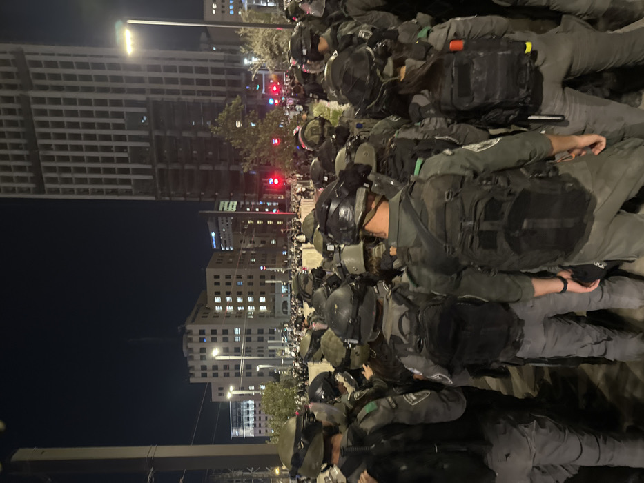 The image depicts a nighttime urban scene on Jaffa Road in central Jerusalem, Israel, identifiable by the prominent, tall, unfinished Migdalei David skyscraper on the right side of the frame, alongside other illuminated multi-story buildings. In the foreground and midground, approximately 15-20 individuals are positioned in a dense formation, viewed primarily from behind. These individuals are uniformed in dark tactical gear, including ballistic helmets (some with visors or accessories), tactical vests, and backpacks. Insignia consistent with Israeli security forces (e.g., police or Border Police) are visible on some uniform sleeves. They are oriented away from the camera, facing a large, indistinct crowd of civilians gathered further down the street in the distance. The scene is illuminated by streetlights, and traffic lights displaying red are visible in the background. A large vertical pole, possibly related to light rail infrastructure, is present on the far left.