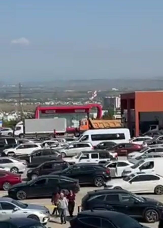 large parking lot filled with cars of various makes and models. The parking lot is located near a building with a sign that reads "Service Agency of MIA" in Georgian and English. In the background, a city skyline can be seen under a clear blue sky. The camera pans slowly across the parking lot, showing the extent of the parked vehicles and the surrounding area.