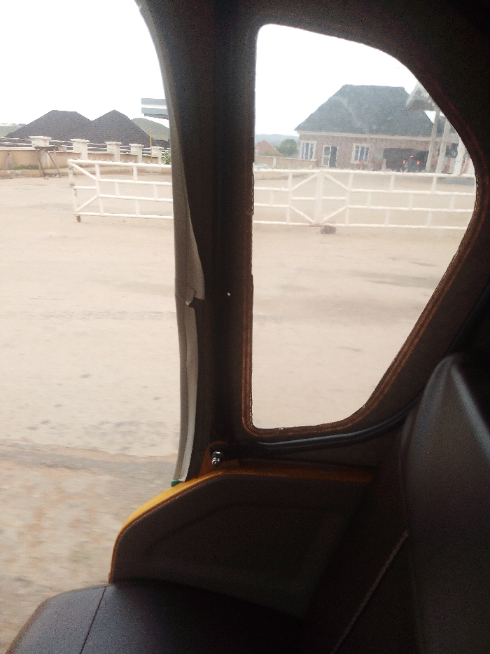 interior of a yellow and brown tricycle, with the driver's seat to the right of the frame and the side window to the left. The window is open, showing a view of a dirt road and a white fence in the distance. There is a building with a gray roof on the other side of the fence. The tricycle appears to be parked near a gas station in Abuja, Federal Capital Territory, Nigeria, at the coordinates provided. The weather is cloudy, and the road is wet.