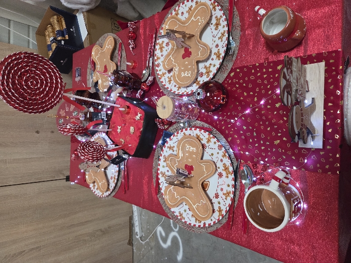 This image depicts a rectangular table meticulously arranged for a festive occasion, located indoors within the city of Blainville-sur-Orne, France. The table is draped with a glittery red tablecloth, overlaid by a narrower red runner patterned with small gold leaf motifs. White string lights are scattered across the table, providing illumination. Four place settings are visible. Each setting features a round, woven charger plate, topped with a white ceramic dinner plate adorned with a pattern of red and gold gingerbread figures and candy canes. Centered on each dinner plate is a flat, light brown, ceramic gingerbread man-shaped dish, some featuring small red bow details. Red-handled cutlery, including forks, spoons, and knives, is positioned at each setting. Small red candles in metallic holders are interspersed among the settings. The central part of the table is occupied by a black, rectangular box-like object covered in red fabric, possibly silk, embroidered with gold gingerbread figures. Two small red candles are placed on top of this object. Several decorative red and white spiral lollipops, some glittery, stand upright on white sticks around the central object. A prominent large lollipop decoration is visible on the far right of the table's surface, with smaller ones also present. Additional small red bows, miniature gift box ornaments, and clear glass votive holders or small tumblers serve as accent decorations. A single red Christmas bauble rests on the table's surface towards the lower right. Towards the bottom center, a wooden cutout display features gingerbread figures and the text "WE WISH YOU A MERRY CHRISTMAS" on a stand, illuminated by integrated lights. Two ceramic mugs, designed to resemble gingerbread houses with candy cane-striped handles, are positioned at the bottom left and right of the table. In the background to the left, a light-toned wooden panel wall or cabinet is visible. A white power strip with a white cable forming an "S" shape is on the floor. To the right, a cardboard box labeled "47" and an open black box containing multiple individually wrapped, gold-colored items are present. A portion of a soft, white object or decoration is partially visible on the far right edge of the frame. No people are present or engaged in any actions.