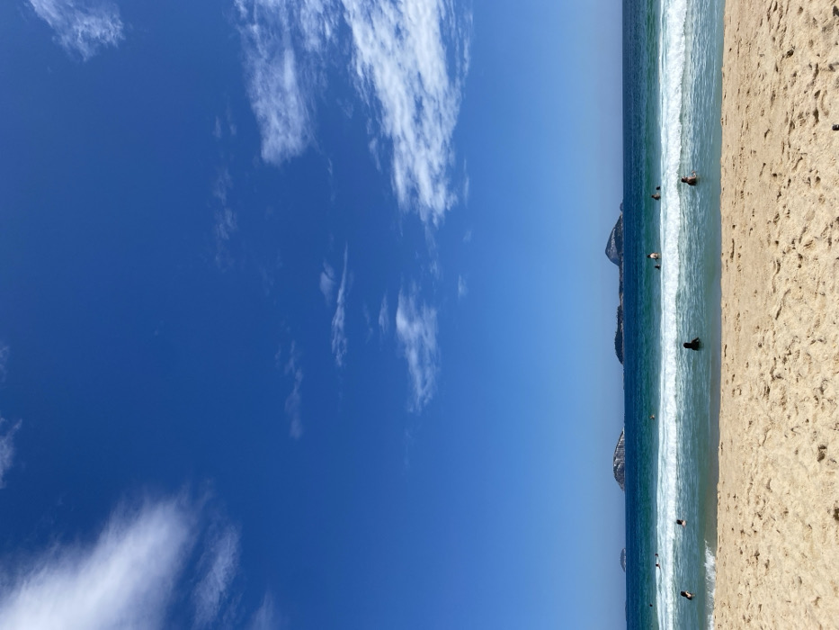A bright blue sky is partially filled with wispy white clouds. Adjacent to the sky, the scene shifts to a beach with tan sand and turquoise water. Gentle waves break along the shoreline. Several people can be seen swimming or wading in the water. In the distance, land formations emerge from the water, adding depth to the scene.