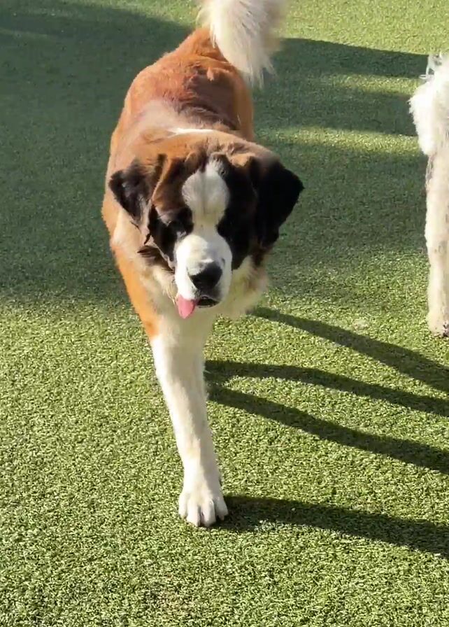 Saint Bernard dog walking on artificial turf toward the camera. Another dog, a smaller black and white poodle, is walking behind the Saint Bernard. At one point a third dog walks into the shot. In the background there are several people and a building. The video is shot in outdoor sunlight.