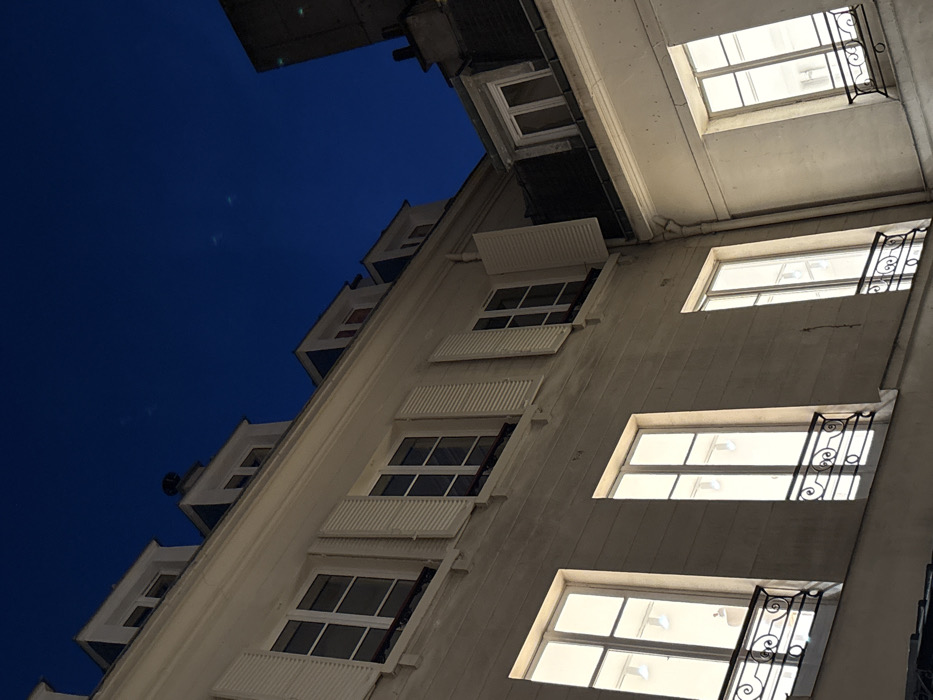 The image displays an upward view of a multi-story building facade in Paris, France, typical of Haussmannian architecture, captured during evening or nighttime hours