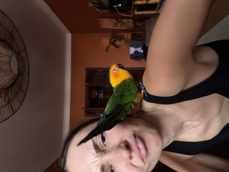 - "A woman with long dark hair and wearing a black tank top is shown with a sun conure perched on her head" by FM-e1BLf2, licensed under CC BY 4.0