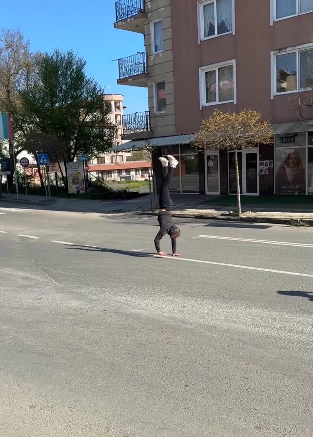 A man in black athletic gear executes a one-handed handstand on the dividing line of a quiet city street on a bright, sunny day. After holding the position for a few seconds, he regains his footing. Another man walks into the frame, filming the first man's gymnastic feat with his phone. Buildings line the street behind them, and a Bulgarian flag is visible in the background.