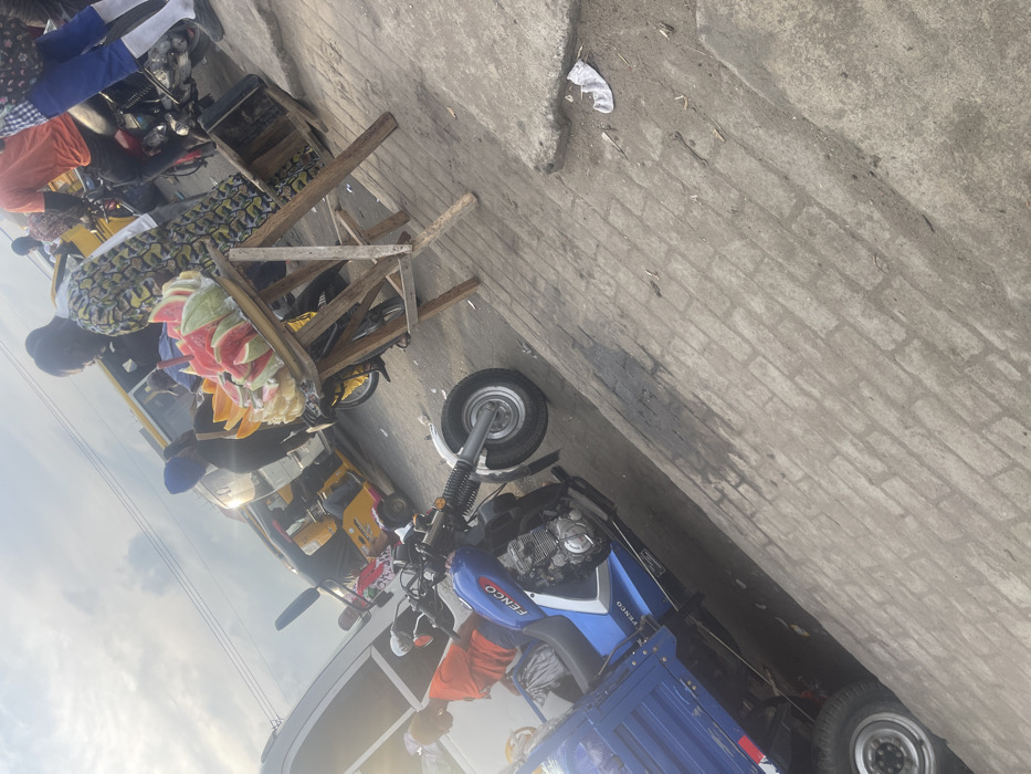 This image depicts a bustling street scene in a commercial or transport hub within Lagos, Nigeria. The ground is paved with interlocking bricks and rough concrete, showing visible wear, dirt, and scattered debris including paper and a discarded white sock. In the foreground-left, a blue FENCO-branded three-wheeled motorized cargo tricycle, also known as an "Abosigi" or "Keke Marwa cargo," is parked. An individual wearing an orange shirt is seated on the driver's seat. Toward the midground, a prominent wooden fruit stall displays an assortment of sliced fruits, specifically red watermelons and yellow melons, arranged on a tray. To the immediate right of this stall, a person in a long, patterned brown and yellow traditional garment stands, facing away from the camera. Several yellow passenger tricycles, commonly referred to as "Keke Marwa" or "Napep" in Lagos, are visible in the midground, with at least one occupied. Near these tricycles, another individual in a dark outfit and a blue head covering is present. Further right and slightly behind the fruit stall, a dark-colored motorcycle ("Okada") is parked, with a person in an orange shirt, blue shorts, and white socks seated on it. A white vehicle, possibly a bus or large van, is partially visible on the far left of the frame. Overhead utility lines traverse the upper portion of the image against a bright, partially cloudy sky, indicating daylight conditions. The scene suggests a dynamic urban environment characterized by commerce and transportation activities.