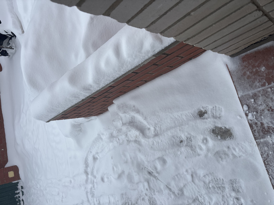 A snowy outdoor scene features a brick-edged step heavily laden with snow