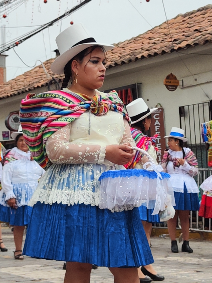 A young woman in traditional Peruvian dress stands out. She wears a white top with lace sleeves, a bright blue pleated skirt with lace trim, and a colorful shawl secured with a decorative pin. Atop her head is a striking white hat. She carries a small, lacy basket. Other women in similar attire are partially visible in the background. The scene is set against a backdrop of buildings with terracotta-colored roofs.