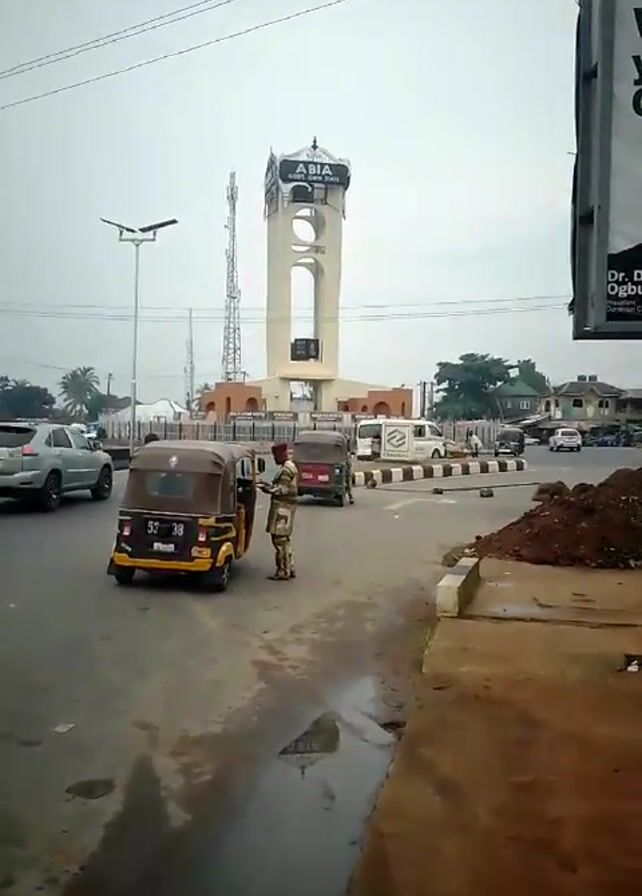 traffic intersection in what appears to be a city in Nigeria. There is a large monument in the center of the intersection with a sign that says "ABIA GODS OWN STATE" on top. A man in camouflage uniform is standing near a yellow three-wheeled vehicle, which appears to be a local form of transportation. Other vehicles including vans and cars are visible in the background. There is a communications tower next to the monument. The road appears wet, and there's a pile of dirt or debris on the side. The overall lighting suggests an overcast day. Other people are also moving around in the background.