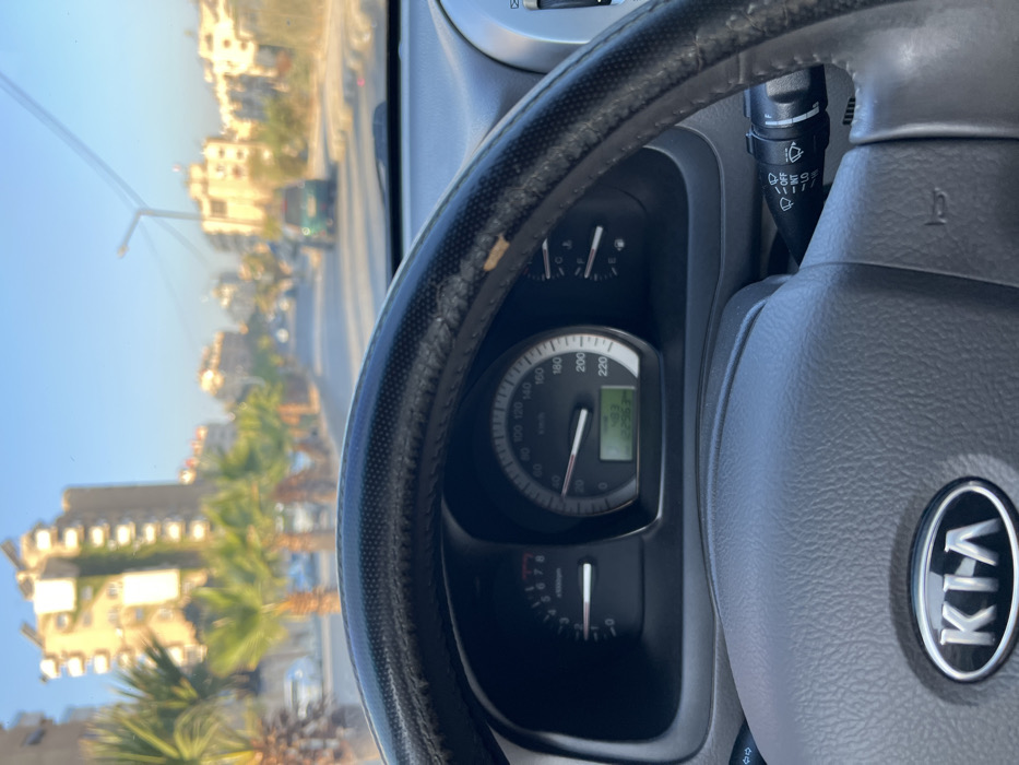 car's interior from the driver's perspective. The steering wheel, with a Kia logo, is prominent. The dashboard displays a speedometer, showing a speed of approximately 40 km/h, and a tachometer. Through the windshield, a street lined with buildings and palm trees is visible under a clear sky. The lighting suggests it's daytime. The overall impression is of driving in a residential or commercial area.