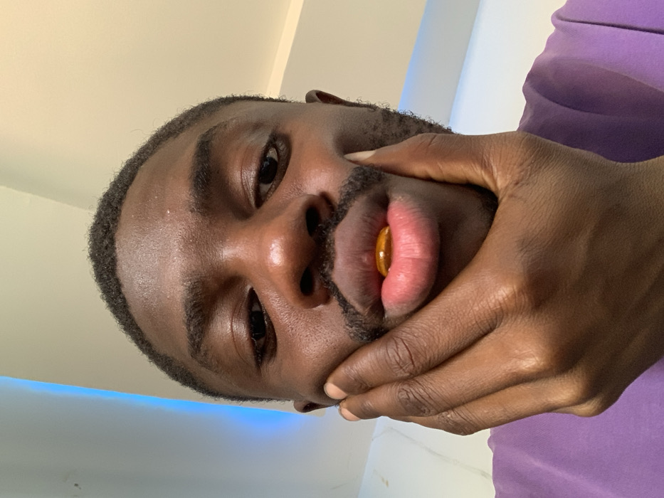 An adult male with dark skin, short dark hair, and facial stubble is depicted in a close-up indoor photograph. He is wearing a purple short-sleeved garment. His right hand is placed against his right cheek and jawline. An amber-colored, translucent capsule is visibly held between his slightly pursed lips. The background features a light-colored wall with a vertical blue illuminated strip on the left, beneath a light-colored ceiling. The scene is located in Jos, Nigeria.