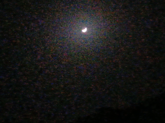 A dimly lit night scene shows a crescent moon shining against a dark sky. The sky itself is a grainy texture of black, green, blue, and red hues, giving the impression of vastness and distance. The very bottom of the image features a darker, indistinct mass that could be trees or a distant horizon. The overall effect is atmospheric and serene, focusing on the celestial body in the night.