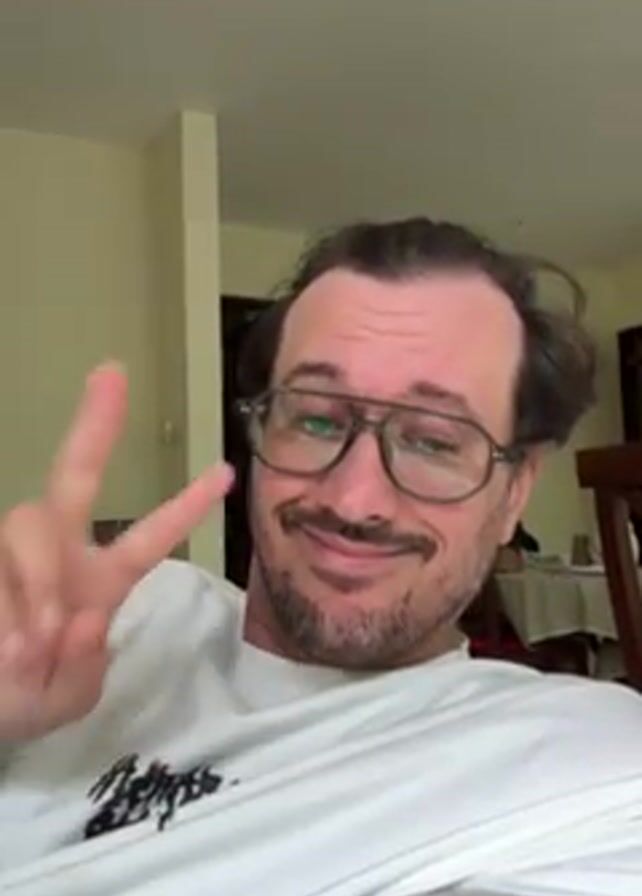 A man wearing glasses and a white t-shirt is sitting indoors. He smiles at the camera and makes various hand gestures, including a peace sign, a wave, and covering his eye with his fingers. The room is sparsely furnished and a table is visible in the background.