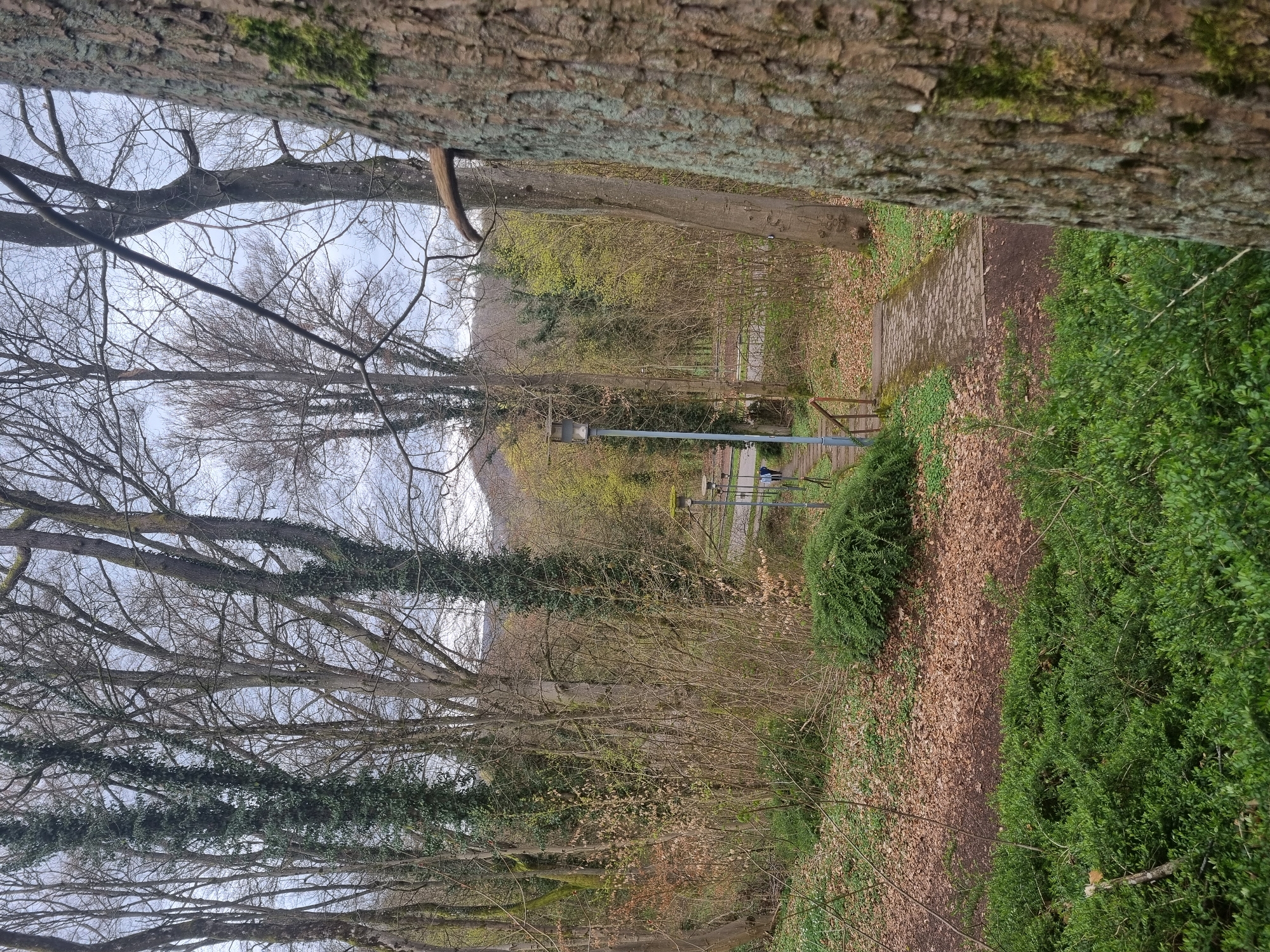 park in Saarbrücken, Germany. The foreground features a large tree trunk with bark, with a tail hanging on the left. The midground displays a path through a wooded area, lined with bare trees and green bushes. A street lamp and two people are visible further down the path. A hill is faintly visible in the background.