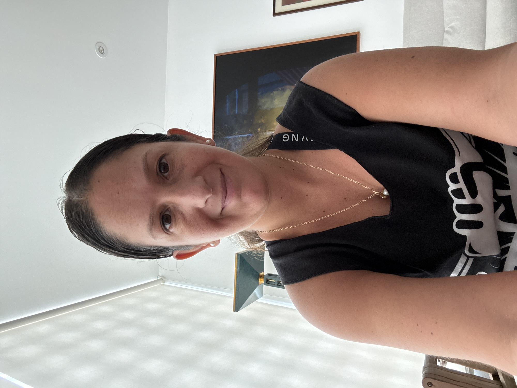 - "A medium, indoor shot shows a woman with wet, dark hair pulled back, wearing a black t-shirt with white graphics, and a gold necklace with a pearl" by FM-E1hwL2, licensed under CC BY 4.0