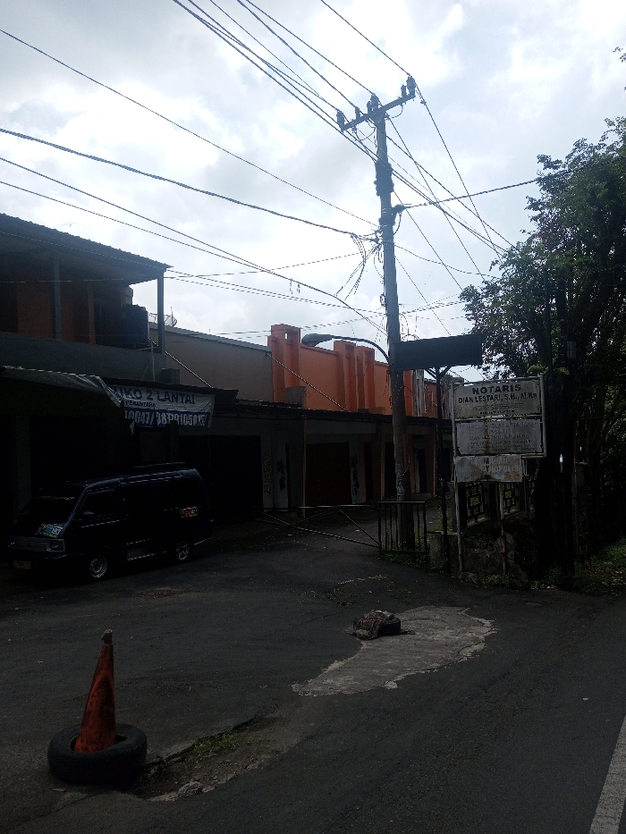 The image displays an urban street scene in Niz Lakuk, India, under an overcast sky. In the foreground, a dark asphalt road is visible, featuring a faded orange traffic cone placed upright within a dark tire on the left side. A patch of lighter gray concrete appears on the road surface further right, with a dark, indistinct bundle of material lying beside it. To the left, a dark-colored minivan is parked, partially in shadow, in front of a row of multi-story buildings. A banner hanging from an awning over a darkened storefront reads "RUKO 2 LANTAI" (Shop House 2 Floors) along with phone numbers. The buildings behind vary in appearance, with some featuring an orange facade and exposed concrete elements. A prominent wooden utility pole stands centrally on the right, laden with numerous black electrical wires and crossarms. A street lamp is attached to this pole. To the right of the utility pole, dense green foliage and trees obscure a portion of the background. A white sign with black text, partially obscured by foliage and the pole, identifies "NOTARIS DIAN LESTARI, S.H., M.Kn." (Notary Dian Lestari) and mentions "MEKROPOLIS". A dark metal gate or barrier is visible further back, separating the road from the commercial structures. No individuals are present in the scene.